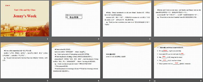 关键词:冀教版八年级上册英语PPT课件免费下载,Jenny's WeekPPT下载,Me and My ClassPPT下载,.PPT格式;