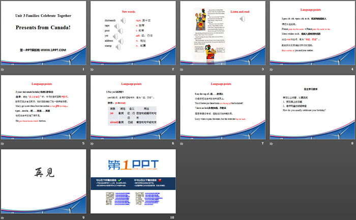关键词:冀教版八年级上册英语PPT课件免费下载,Presents from Canada!PPT下载,Families Celebrate TogetherPPT下载,.PPT格式;