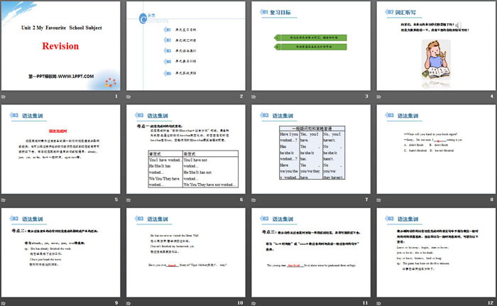 关键词:冀教版八年级上册英语PPT课件免费下载,RevisionPPT下载,My Favourite School SubjectPPT下载,.PPT格式;