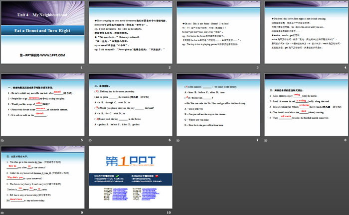 关键词:冀教版八年级上册英语PPT课件免费下载,Eat a Donut and Turn RightPPT下载,My NeighbourhoodPPT下载,.PPT格式;