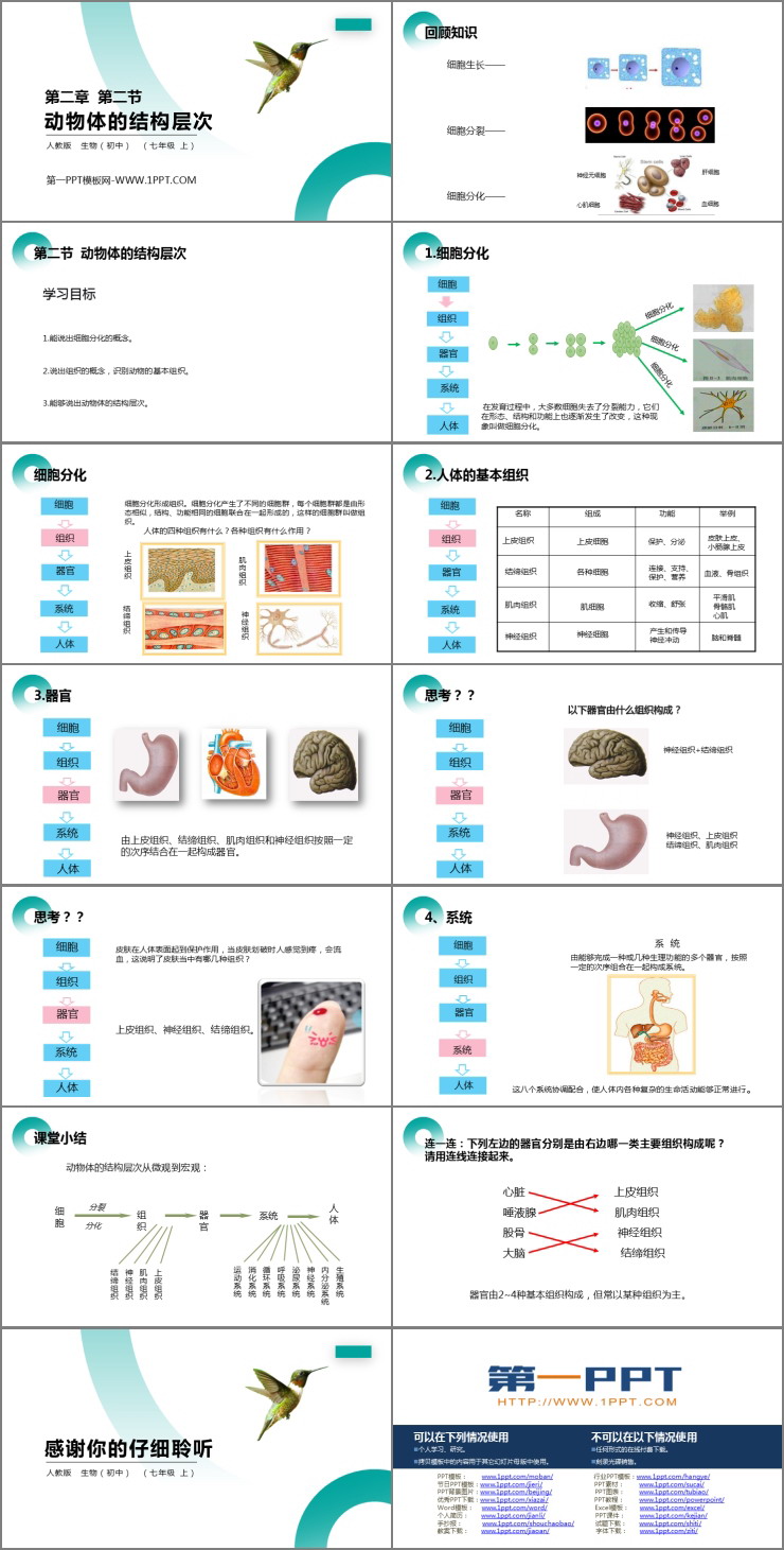 《动物体的结构层次》PPT精品课件包含学习目标、回顾知识、课堂小结三部分。