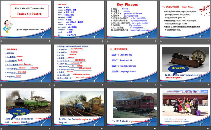 关键词:冀教版八年级上册英语PPT课件免费下载,Trains Go Faster!PPT下载,Go with Transportation!PPT下载,.PPT格式;