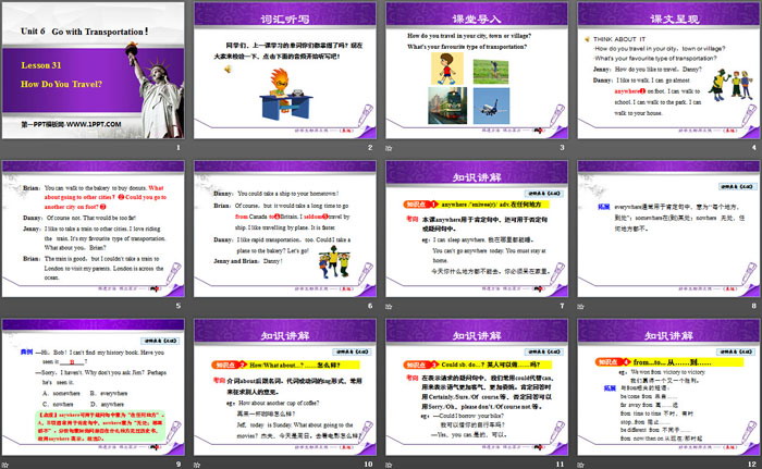 关键词:冀教版八年级上册英语PPT课件免费下载,How Do You Travel?PPT下载,Go with Transportation!PPT下载,.PPT格式;