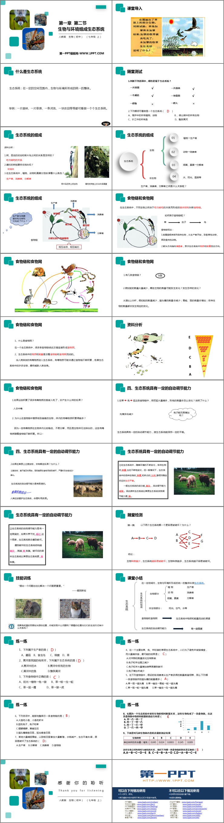 《生物与环境组成生态系统》PPT精品课件包含课堂导入、知识解析、课堂小结、课堂检测四部分。