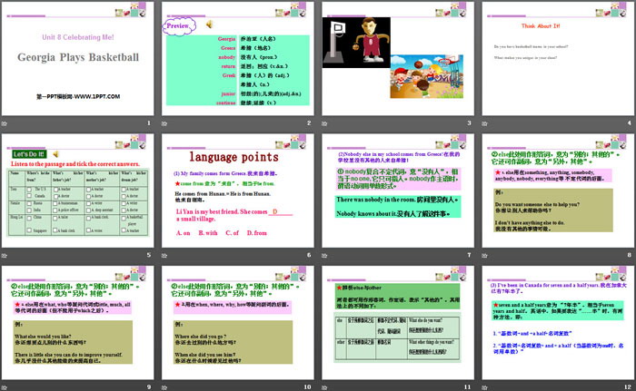 关键词:冀教版八年级上册英语PPT课件免费下载,Georgia Plays BasketballPPT下载,Celebrating Me!PPT下载,.PPT格式;