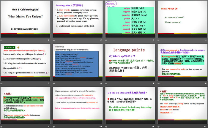 关键词:冀教版八年级上册英语PPT课件免费下载,What Makes You Unique?PPT下载,Celebrating Me!PPT下载,.PPT格式;