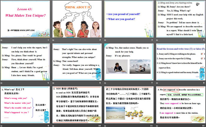 关键词:冀教版八年级上册英语PPT课件免费下载,What Makes You Unique?PPT下载,Celebrating Me!PPT下载,.PPT格式;