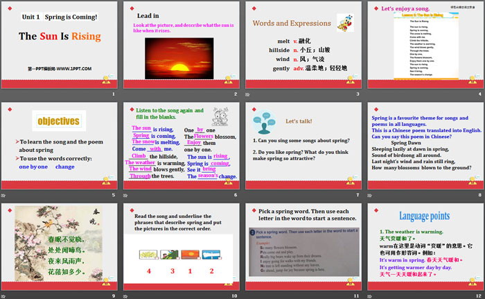 关键词:冀教版八年级下册英语PPT课件免费下载,The Sun Is RisingPPT下载,Spring Is ComingPPT下载,.PPT格式;