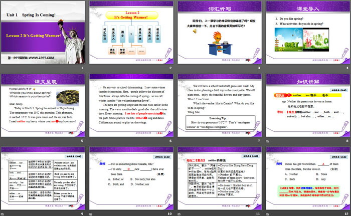 关键词:冀教版八年级下册英语PPT课件免费下载,It's Getting Warmer!PPT下载,Spring Is ComingPPT下载,.PPT格式;