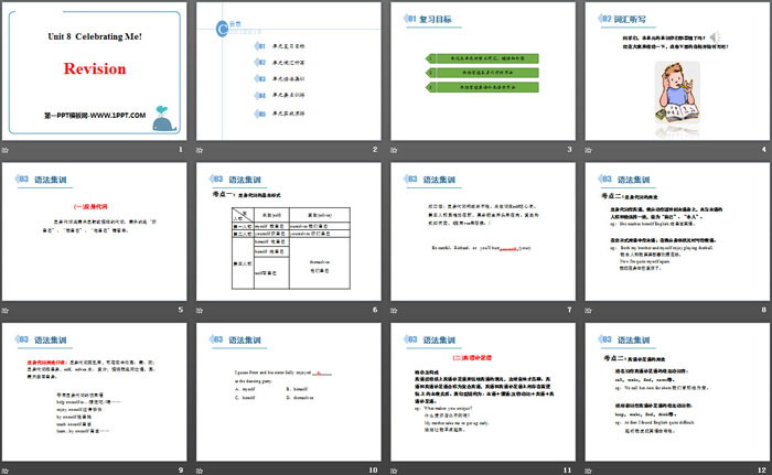 关键词:冀教版八年级上册英语PPT课件免费下载,RevisionPPT下载,Celebrating Me!PPT下载,.PPT格式;