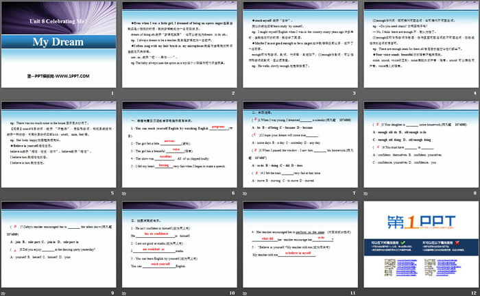 关键词:冀教版八年级上册英语PPT课件免费下载,My DreamPPT下载,Celebrating Me!PPT下载,.PPT格式;