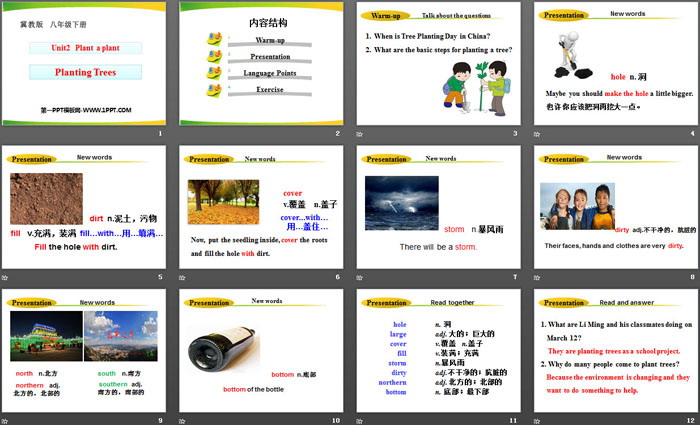 关键词:冀教版八年级下册英语PPT课件免费下载,Planting TreesPPT下载,Plant a PlantPPT下载,.PPT格式;