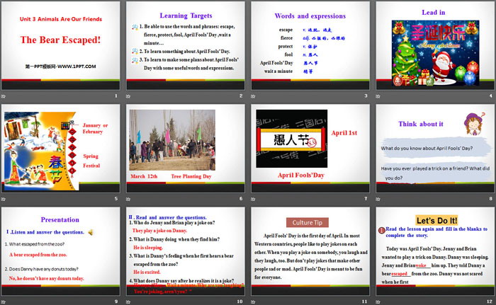 1. Learned many new words and phrases: escape, fierce, protect, fool, April Fools’Day ,wait a minute...