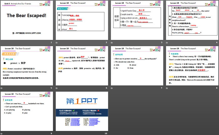 关键词:冀教版八年级下册英语PPT课件免费下载,The Bear Escaped!PPT下载,Animals Are Our FriendsPPT下载,.PPT格式;