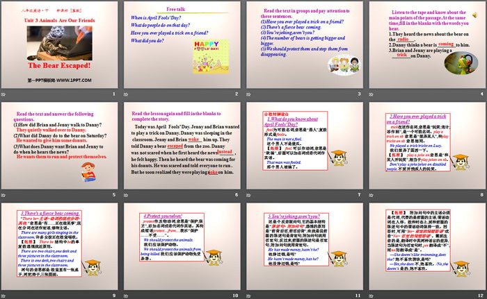 关键词:冀教版八年级下册英语PPT课件免费下载,The Bear Escaped!PPT下载,Animals Are Our FriendsPPT下载,.PPT格式;