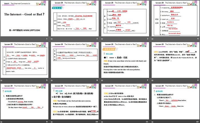 关键词:冀教版八年级下册英语PPT课件免费下载,The Internet-Good or Bad?PPT下载,The Internet Connects UsPPT下载,.PPT格式;