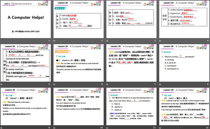 关键词:冀教版八年级下册英语PPT课件免费下载,A Computer Helps!PPT下载,The Internet Connects UsPPT下载,.PPT格式;