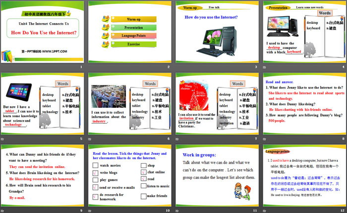 关键词:冀教版八年级下册英语PPT课件免费下载,How Do You Use the Internet?PPT下载,The Internet Connects UsPPT下载,.PPT格式;