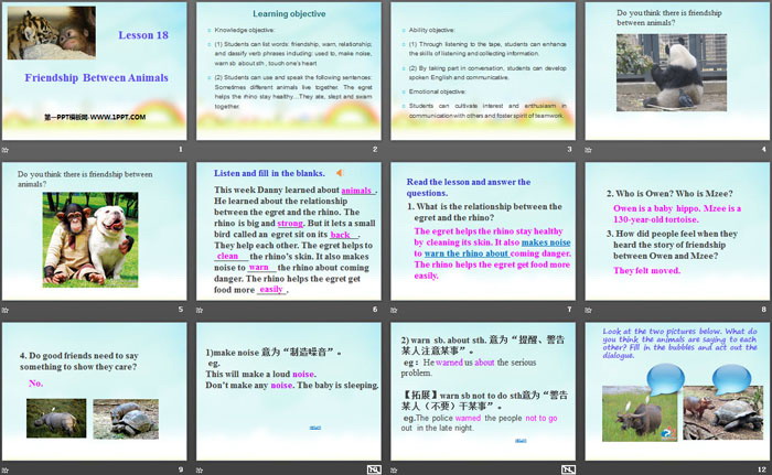 关键词:冀教版八年级下册英语PPT课件免费下载,Friendship Between AnimalsPPT下载,Animals Are Our FriendsPPT下载,.PPT格式;