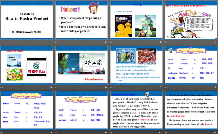 关键词:冀教版八年级下册英语PPT课件免费下载,How to Push a Product?PPT下载,Buying and SellingPPT下载,.PPT格式;