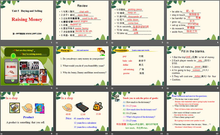关键词:冀教版八年级下册英语PPT课件免费下载,Raising MoneyPPT下载,Buying and SellingPPT下载,.PPT格式;
