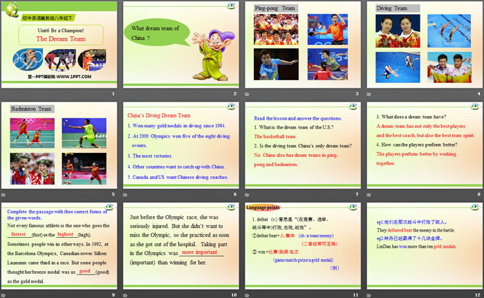 关键词:冀教版八年级下册英语PPT课件免费下载,The Dream TeamPPT下载,Be a Champion!PPT下载,.PPT格式;