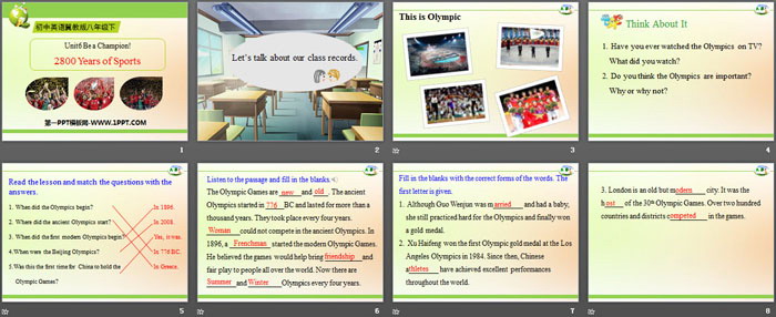 关键词:冀教版八年级下册英语PPT课件免费下载,2800 Years of SportsPPT下载,Be a Champion!PPT下载,.PPT格式;