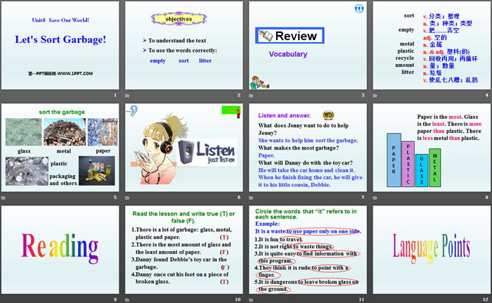 关键词:冀教版八年级下册英语PPT课件免费下载,Let's Sort GarbagePPT下载,Save Our World!PPT下载,.PPT格式;