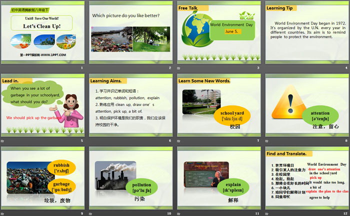 关键词:冀教版八年级下册英语PPT课件免费下载,Let's Clean Up!PPT下载,Save Our World!PPT下载,.PPT格式;