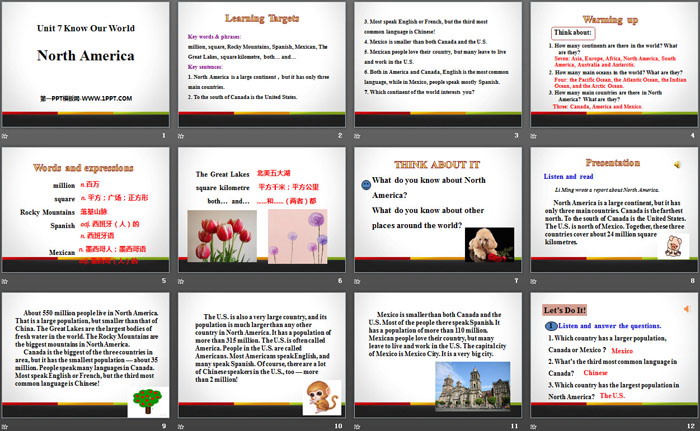 关键词:冀教版八年级下册英语PPT课件免费下载,North AmericaPPT下载,Know Our WorldPPT下载,.PPT格式;