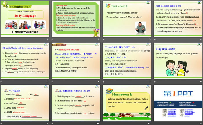 关键词:冀教版八年级下册英语PPT课件免费下载,Body LanguagePPT下载,Know Our WorldPPT下载,.PPT格式;