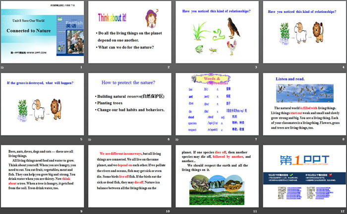 关键词:冀教版八年级下册英语PPT课件免费下载,Connected to NaturePPT下载,Save Our World!PPT下载,.PPT格式;