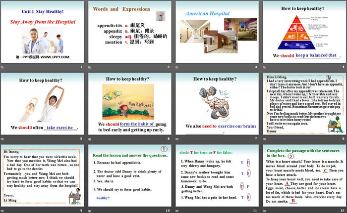 关键词:冀教版九年级上册英语PPT课件免费下载,Stay Away from the HospitalPPT下载,Stay healthyPPT下载,.PPT格式;