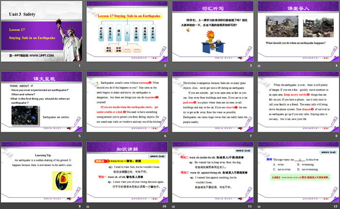 关键词:冀教版九年级上册英语PPT课件免费下载,Staying Safe in an EarthquakePPT下载,SafetyPPT下载,.PPT格式;