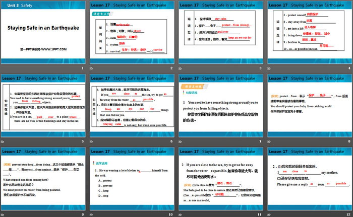 关键词:冀教版九年级上册英语PPT课件免费下载,Staying Safe in an EarthquakePPT下载,SafetyPPT下载,.PPT格式;