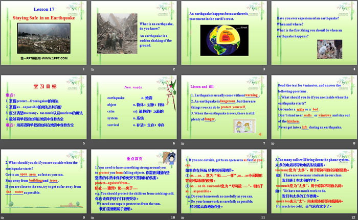 关键词:冀教版九年级上册英语PPT课件免费下载,Staying Safe in an EarthquakePPT下载,SafetyPPT下载,.PPT格式;