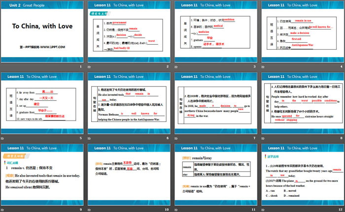 关键词:冀教版九年级上册英语PPT课件免费下载,To China,with LovePPT下载,Great PeoplePPT下载,.PPT格式;