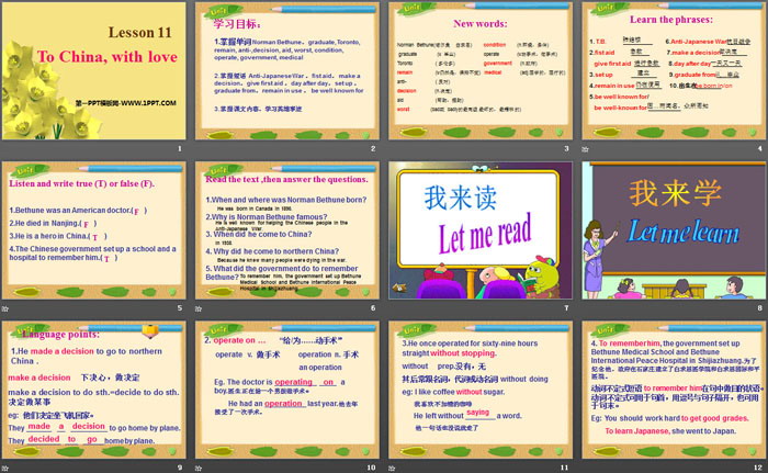 1.掌握单词 Norman Bethune,graduate, Toronto, remain, anti-,decision, aid, worst, condition, operate, government, medical