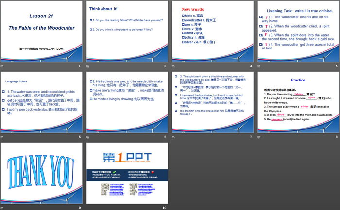 关键词:冀教版九年级上册英语PPT课件免费下载,The Fable of the WoodcutterPPT下载,Stories and PoemsPPT下载,.PPT格式;