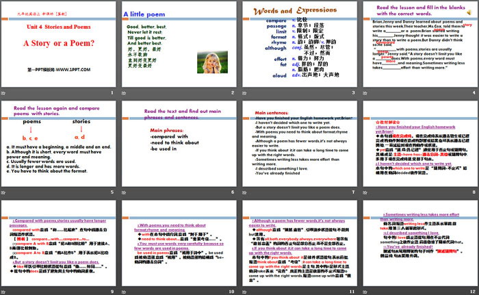 关键词:冀教版九年级上册英语PPT课件免费下载,A Story or a Poem?PPT下载,Stories and PoemsPPT下载,.PPT格式;