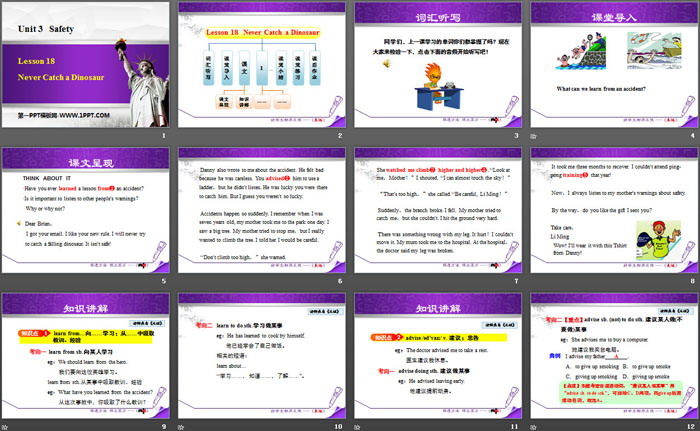 关键词:冀教版九年级上册英语PPT课件免费下载,Never Catch a DinosaurPPT下载,SafetyPPT下载,.PPT格式;