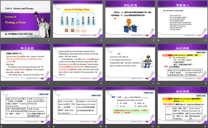 关键词:冀教版九年级上册英语PPT课件免费下载,Writing a PoemPPT下载,Stories and PoemsPPT下载,.PPT格式;