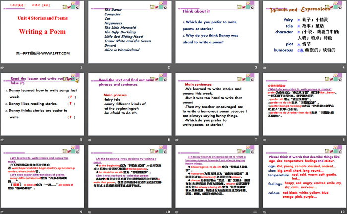 关键词:冀教版九年级上册英语PPT课件免费下载,Writing a PoemPPT下载,Stories and PoemsPPT下载,.PPT格式;