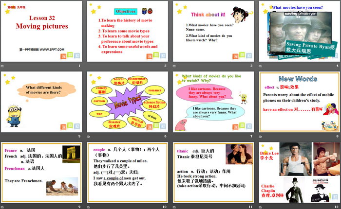 关键词:冀教版九年级上册英语PPT课件免费下载,Moving PicturesPPT下载,Movies and TheatrePPT下载,.PPT格式;