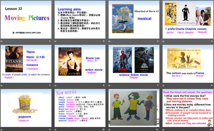 关键词:冀教版九年级上册英语PPT课件免费下载,Moving PicturesPPT下载,Movies and TheatrePPT下载,.PPT格式;