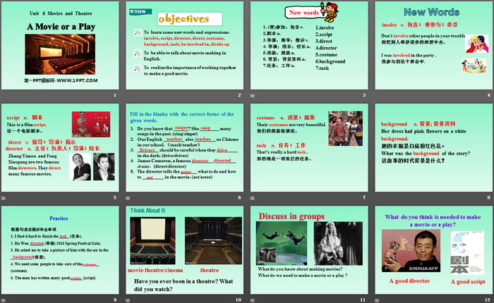 To learn some new words and expressions: involve, script, director, direct, costume, background, task; be involved in, divide up