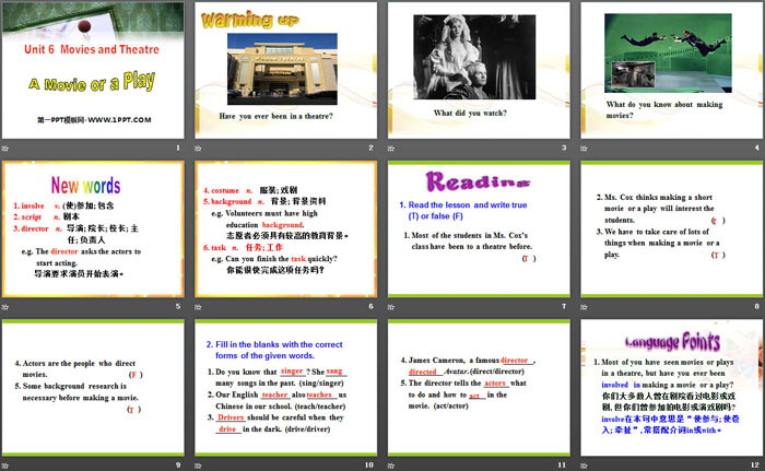关键词:冀教版九年级上册英语PPT课件免费下载,A movie or a PlayPPT下载,Movies and TheatrePPT下载,.PPT格式;