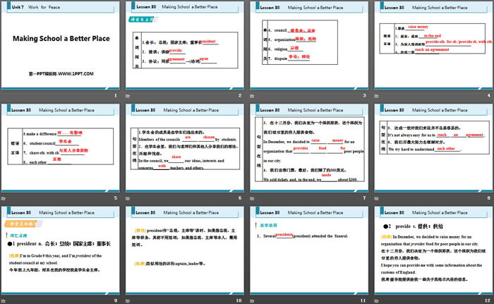 关键词:冀教版九年级下册英语PPT课件免费下载,Making School a Better PlacePPT下载,Work for PeacePPT下载,.PPT格式;