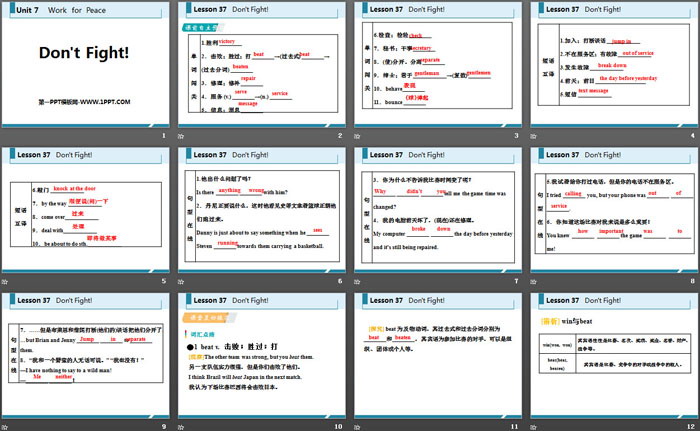 关键词:冀教版九年级下册英语PPT课件免费下载,Don't Fight!PPT下载,Work for PeacePPT下载,.PPT格式;