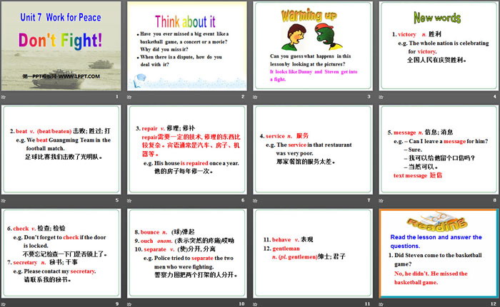 关键词:冀教版九年级下册英语PPT课件免费下载,Don't Fight!PPT下载,Work for PeacePPT下载,.PPT格式;
